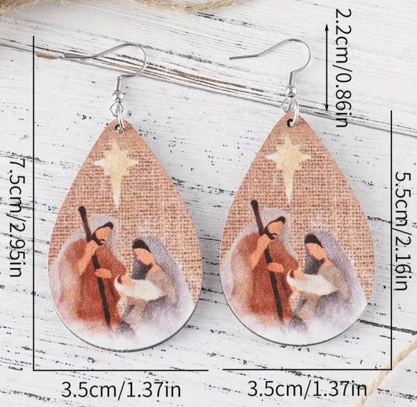 These Nativity Christmas Earrings beautifully capture the true meaning of Christmas with a wooden dangle design featuring a nativity scene. Perfect for anyone who wants to show their faith during the holiday season.