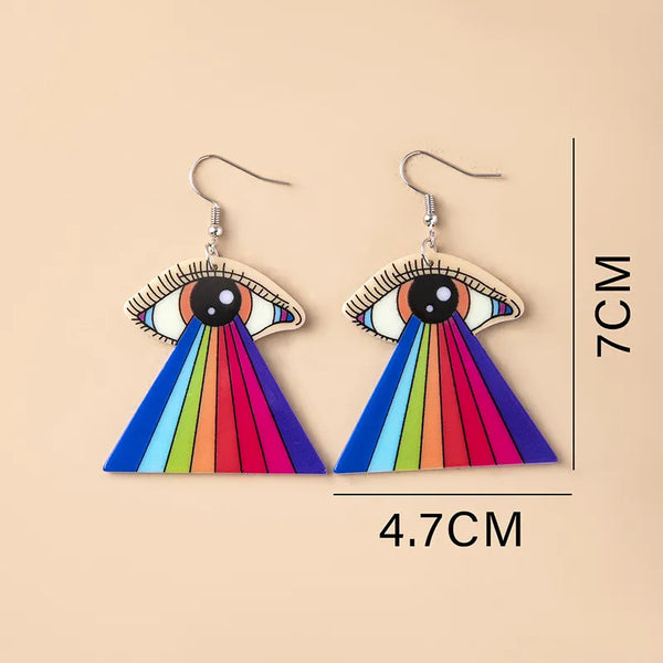 Experience a pop of color and add a touch of quirkiness to your ensemble with our Rainbow Eye Earrings. These dangle earrings are made of durable acrylic material, ensuring long-lasting wear. Perfect for those looking to make a bold fashion statement.